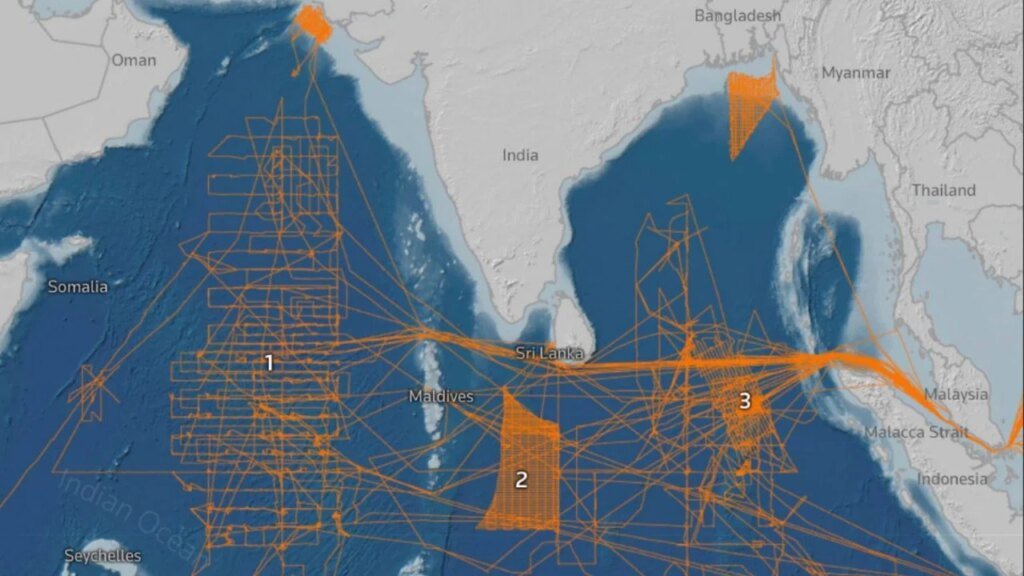 Para recopilar información sobre el terreno submarino, los buques de investigación cartografían el lecho marino mientras navegan de un lado a otro en líneas muy cerradas. Los datos de seguimiento muestran ese tipo de movimientos por parte de los buques que Reuters rastreó en amplias zonas de los océanos antes mencionados.